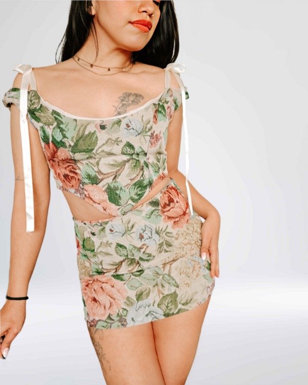 El Set Rosedal es una cápsula vintage. Tapicería floral, estructura cómoda y detalles que enamoran. Corset con breteles de cinta + mini recta al cuerpo.