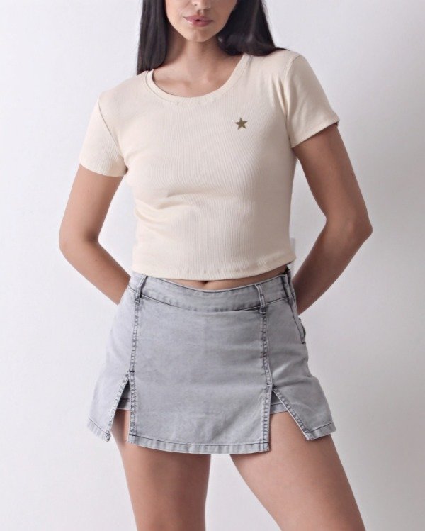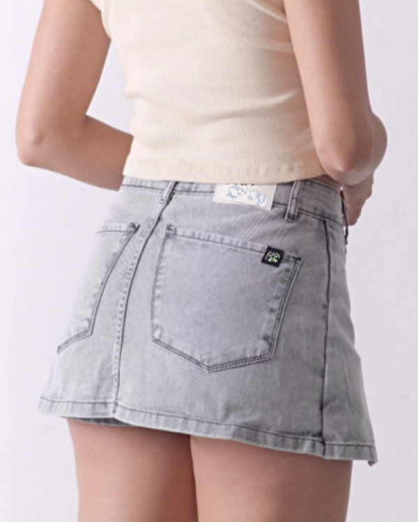 Skort de jean rígido. El short interno es del mismo jean de la "mini". Tajos laterales, cierre reforzado. Es Tiro Medio, queda debajo del ombligo pero un poco más alto que la cadera.