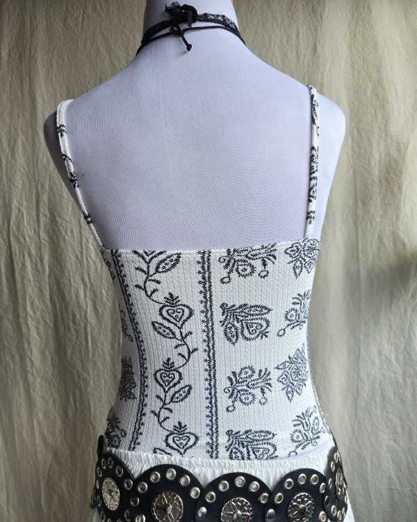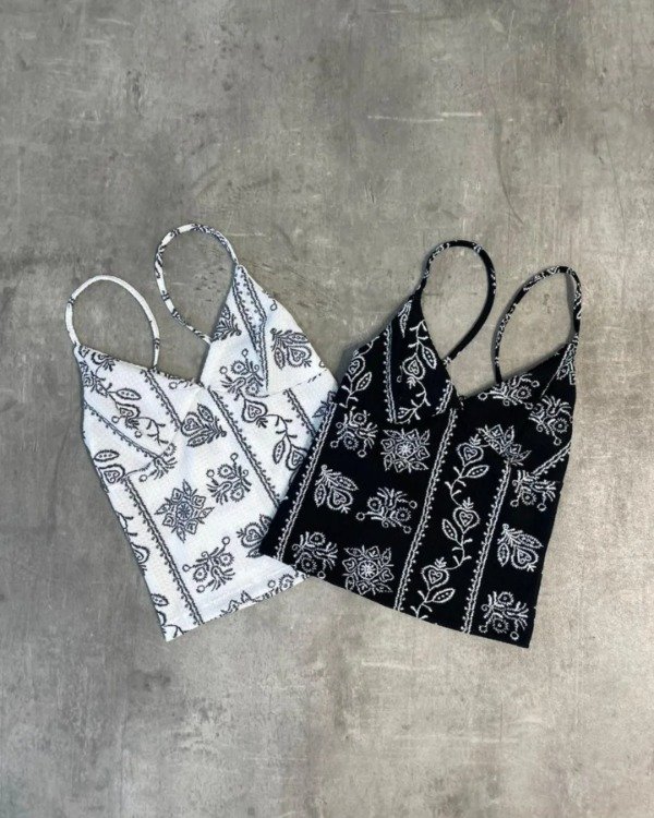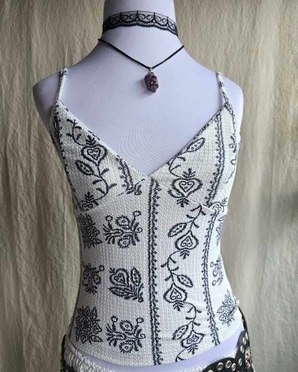 El Top Juana tiene ese aire boho con dibujos tipo búlgaros que lo hacen único —ideal para usar con faldas largas, jeans, skorts. Lo q quieras.