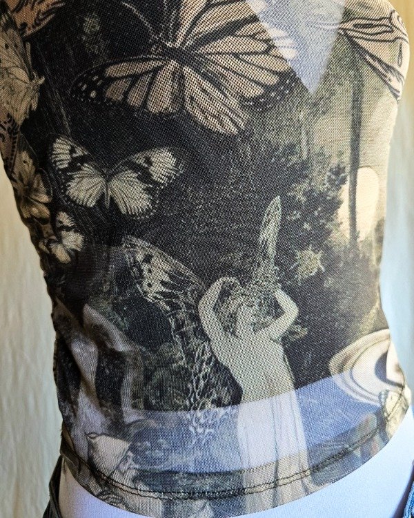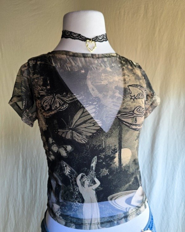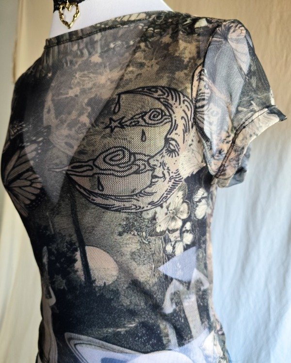 El Top Hada está confeccionado en microtul elástico translúcido, con un estampado etéreo de lunas, mariposas y figuras míticas que parece sacado de un sueño.