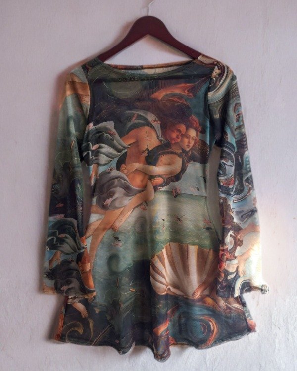 Estampado exclusivo inspirado en El nacimiento de Venus de Sandro Botticelli, una de las obras más emblemáticas del Renacimiento, reinterpretada en una prenda actual.