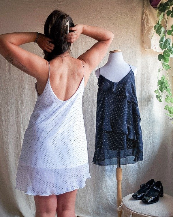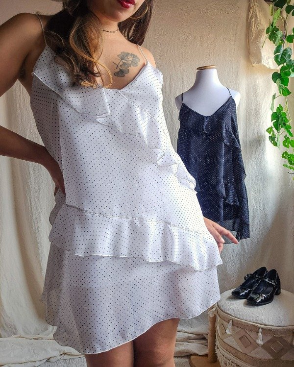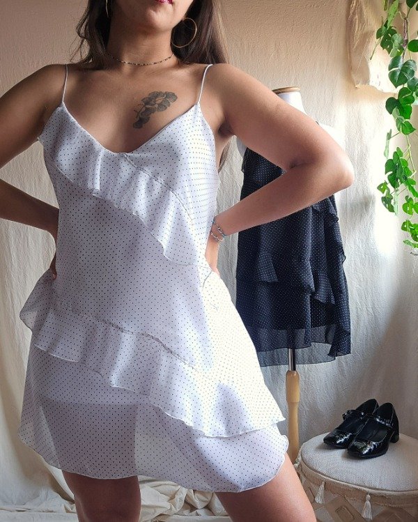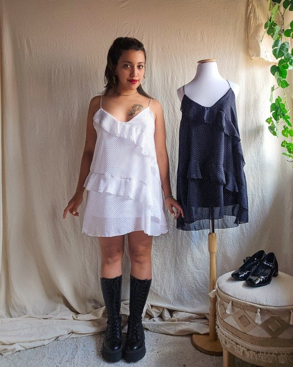 Escote con volado y espalda escotada. Lo podés usar tanto con sandalias como con borcegos.