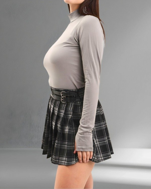 Tableada, con corte perfecto con movimiento y hebillas laterales en eco-cuero que le dan el toque rocker que necesitabas ⚡.