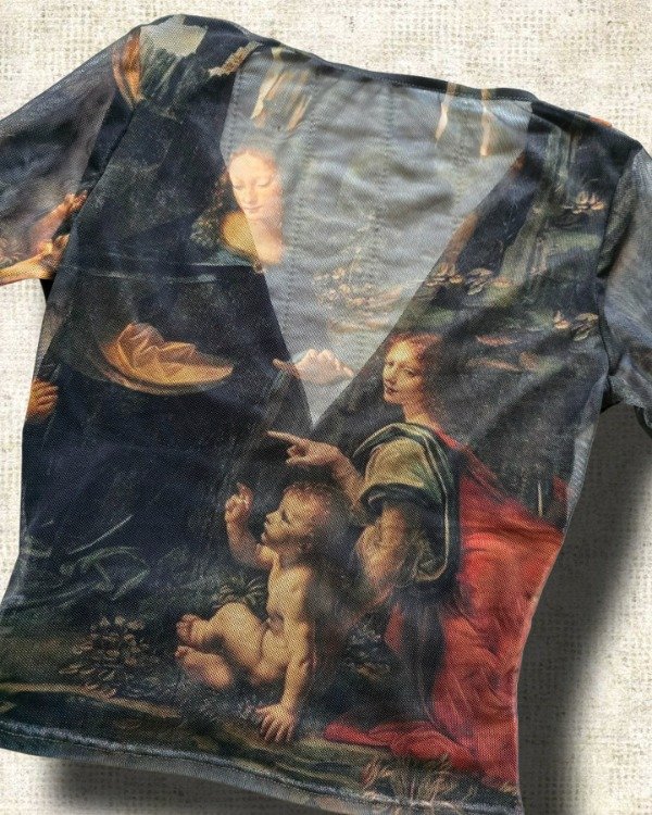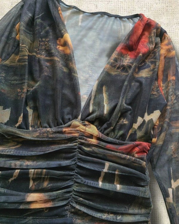 Tiene escote en V profundo y frunces centrales (ruched) que estilizan la figura sin apretar. El frente está forrado para que lo uses sin corpiño si querés. La espalda es sólo la transparencia. Te queda como tatuada por el mismo Leonardo🎨