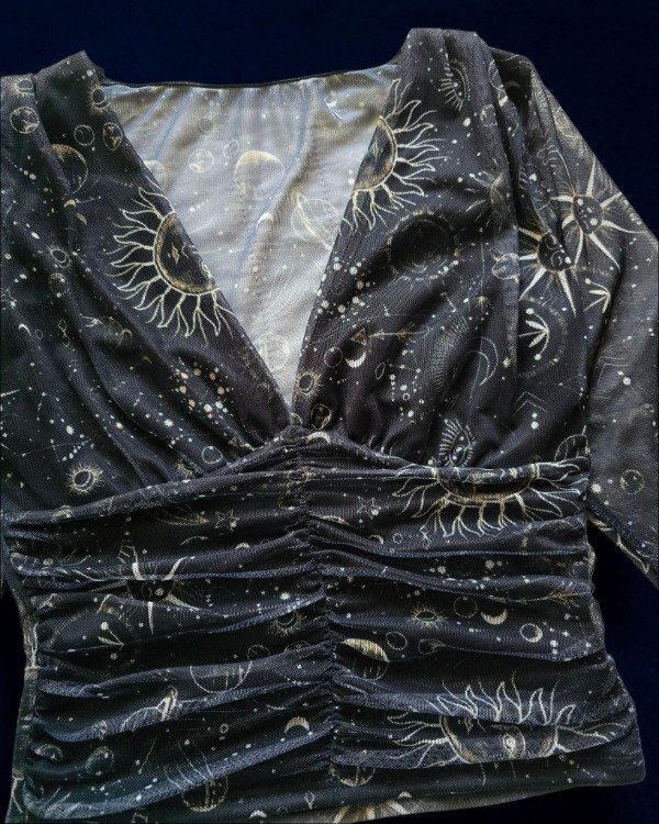 Tiene escote en V profundo y frunces centrales (ruched) que estilizan la figura sin apretar. El frente está forrado para que lo uses sin corpiño si querés. La espalda es sólo la transparencia. Te queda como tatuada por el mismo Boucher🎨