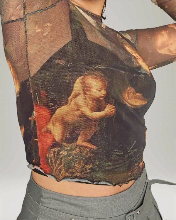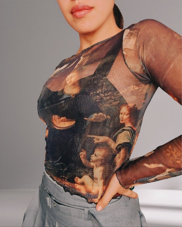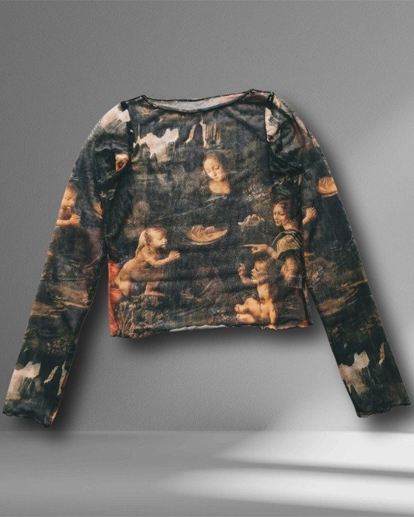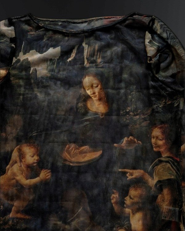 La imagen que aparece estampada en la remera es "La Virgen de las Rocas" (La Vergine delle Rocce) de Leonardo da Vinci. 🎨Existen 3 versiones de esta obra: una está en el Louvre (París), otra en la National Gallery (Londres), la 3era puede estar en tu placard 😉 Todas, muestran a la Virgen María con el Niño Jesús, el Niño Juan Bautista y un ángel en un entorno rocoso y misterioso.