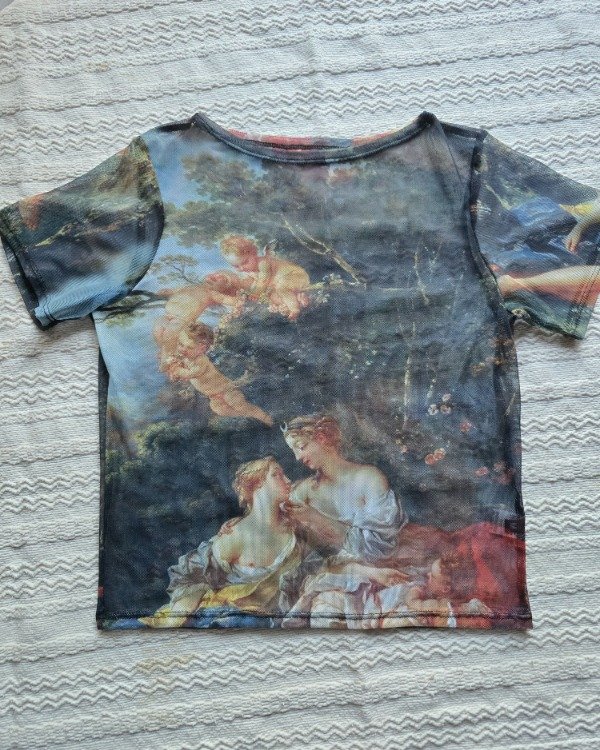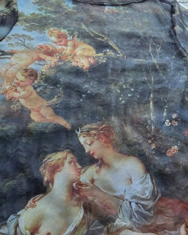 Confeccionado en microtul elástico translúcido, estampado con arte.