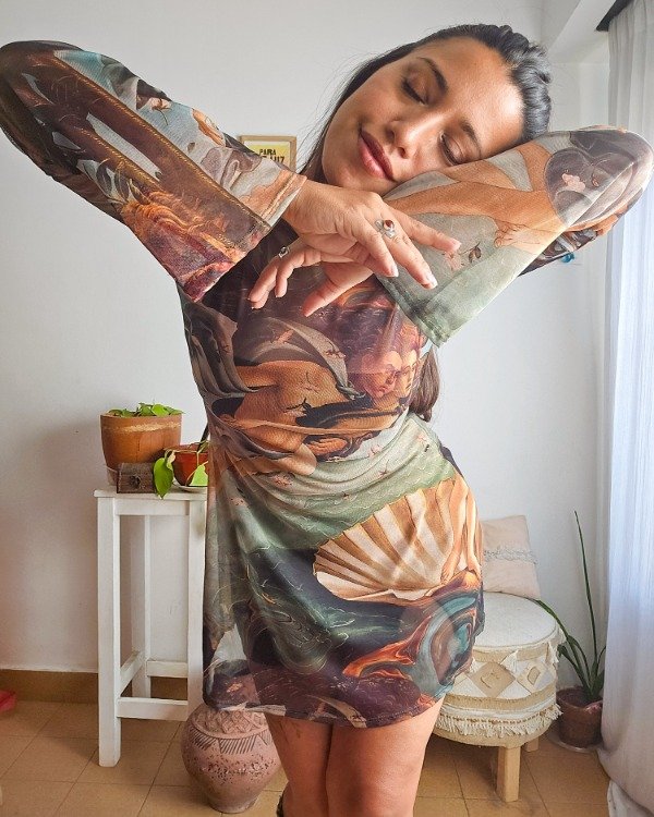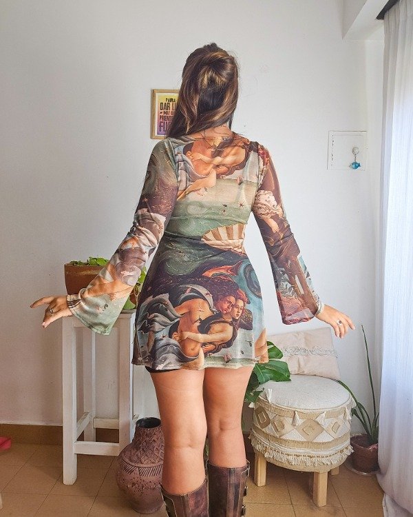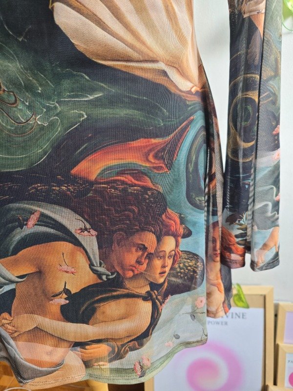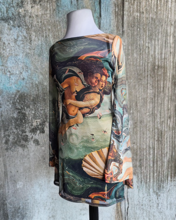 Estampado exclusivo inspirado en El nacimiento de Venus de Sandro Botticelli, una de las obras más emblemáticas del Renacimiento, reinterpretada en una prenda actual.