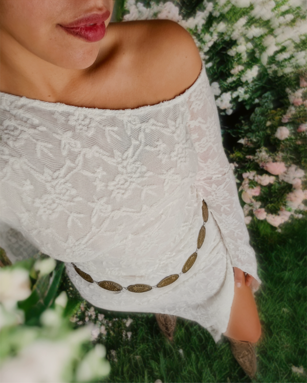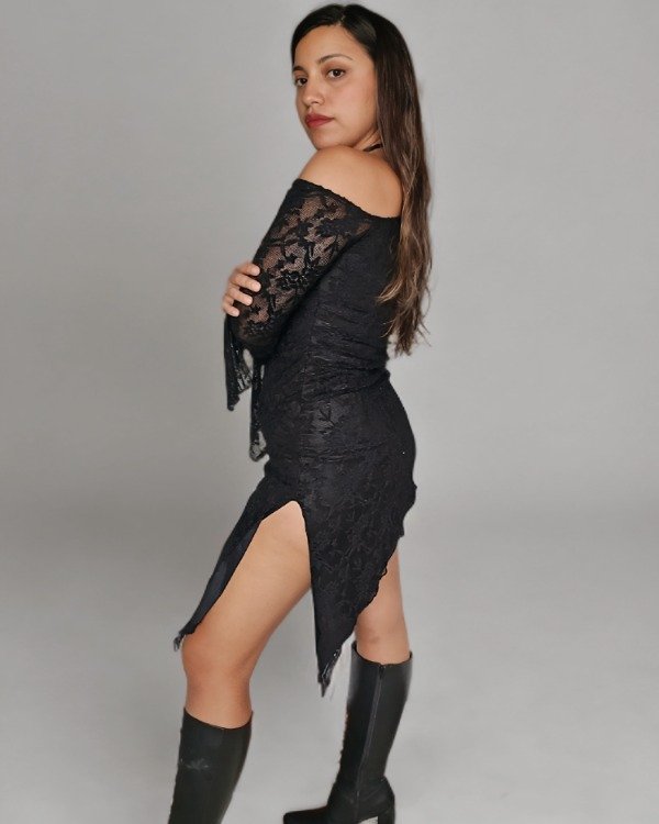 Vestido irregular de encaje forrado en torso. Mangas con transparencia y con una caída única. Tajo en pierna izquierda. Usalo como vestido o con un jean abajo, un palazzo o falda larga.