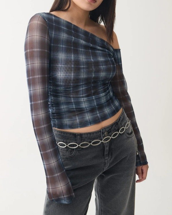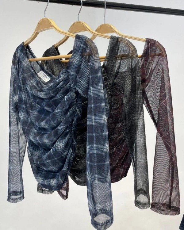 Top de microtul xon cuello irregular en escocés azul, bordó y gris.